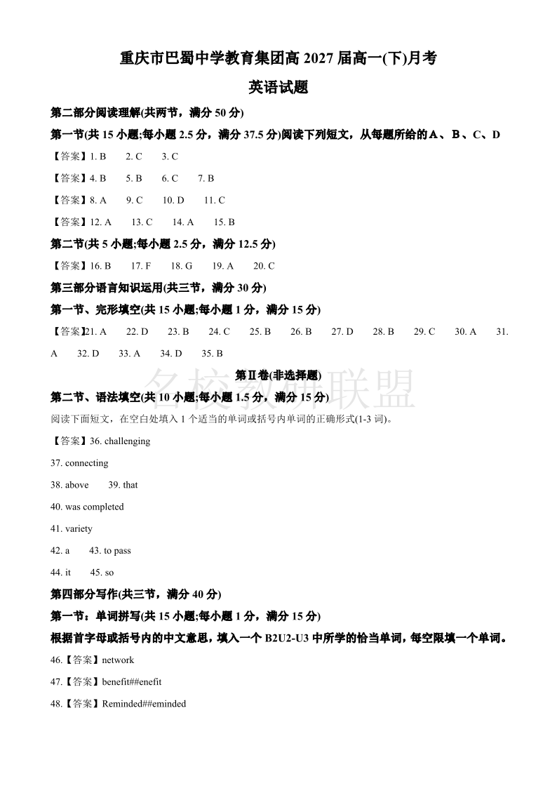 重庆市巴蜀中学高2027届高一(下)3月月考 英语答案.pdf