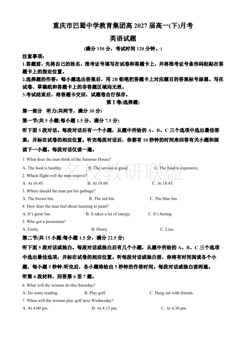 重庆市巴蜀中学高2027届高一(下)3月月考 英语.pdf