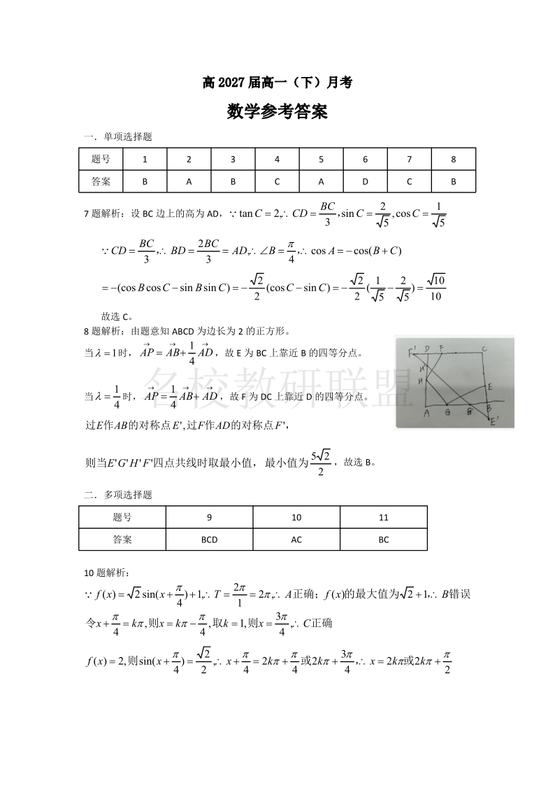 重庆市巴蜀中学高2027届高一(下)3月月考 数学答案.pdf