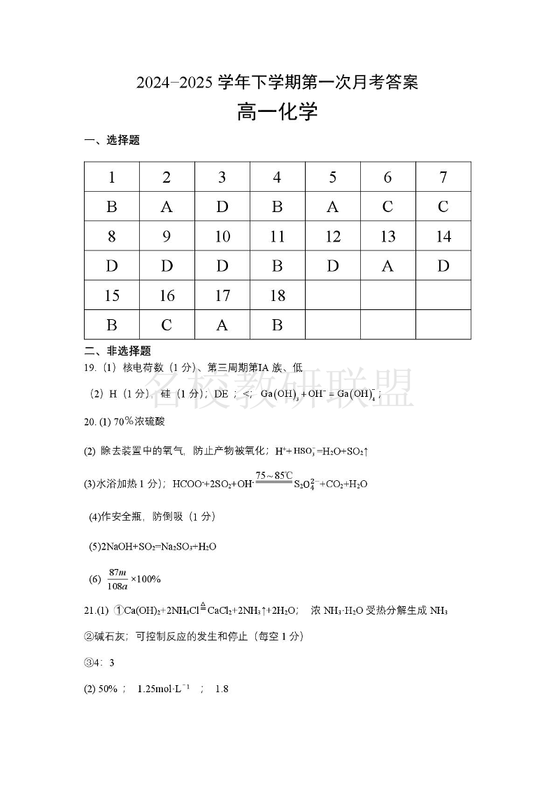 重庆市巴蜀中学高2027届高一(下)3月月考 化学答案.pdf