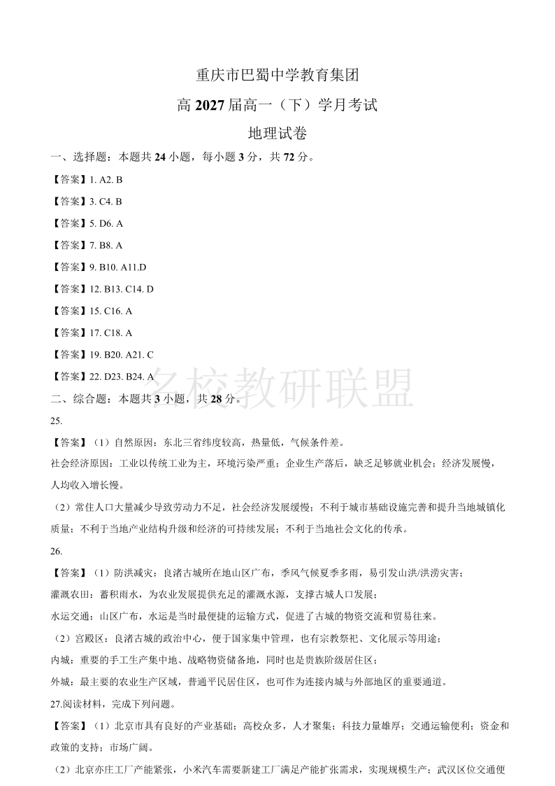重庆市巴蜀中学高2027届高一(下)3月月考 地理答案.pdf