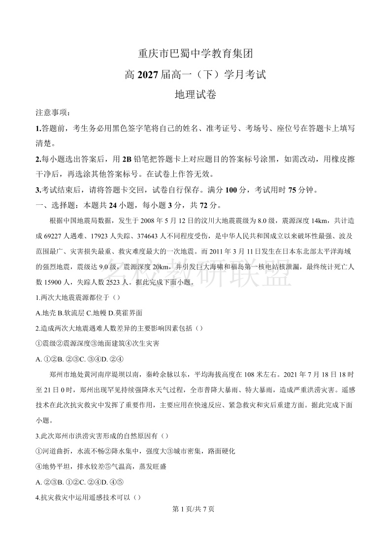 重庆市巴蜀中学高2027届高一(下)3月月考 地理.pdf