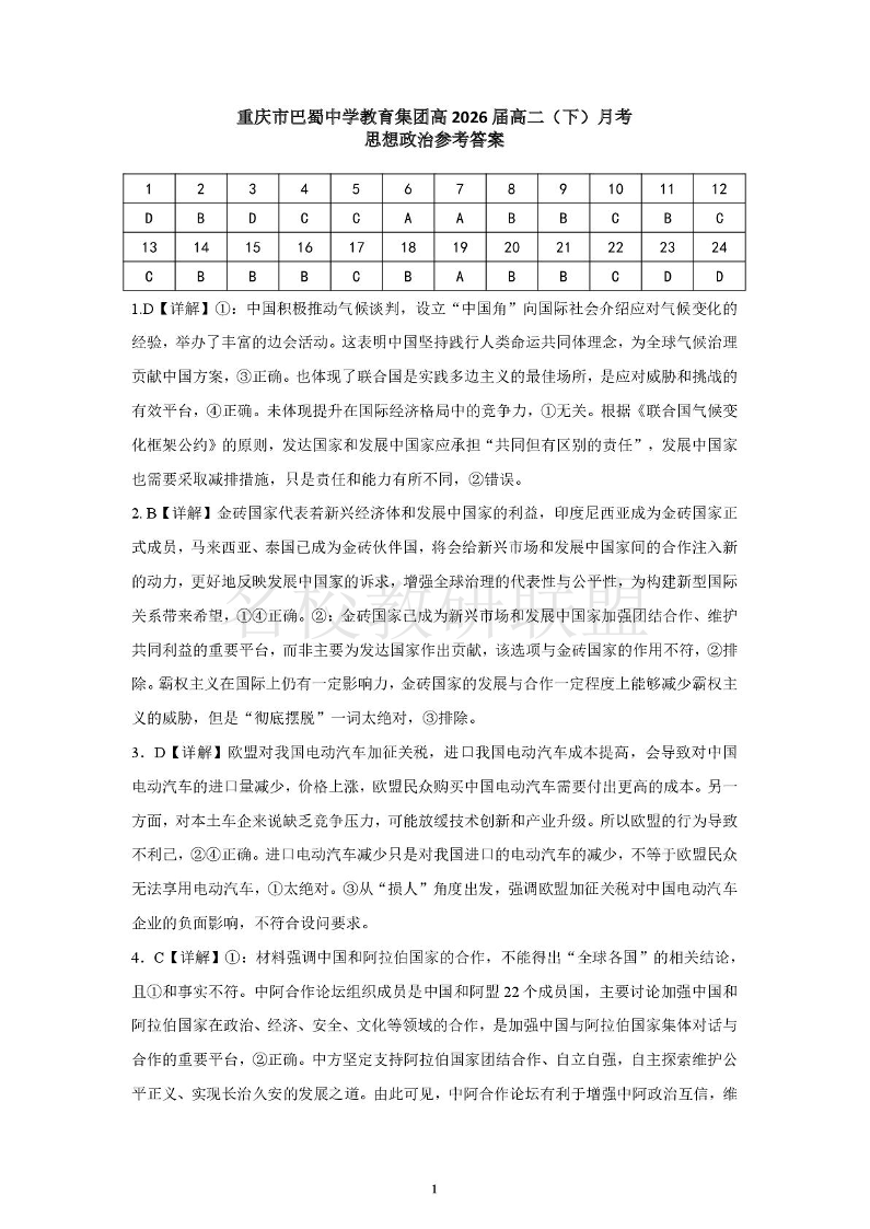 重庆市巴蜀中学高2026届高二(下)3月月考 政治答案.pdf