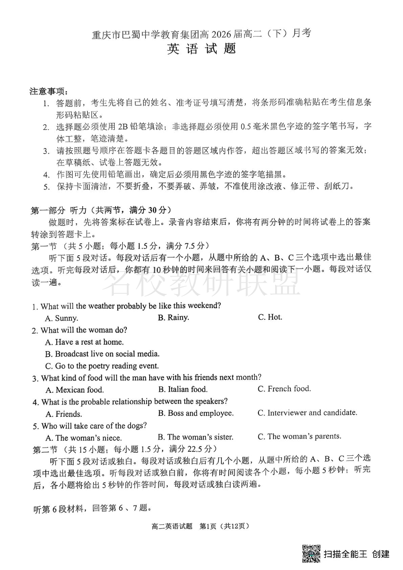 重庆市巴蜀中学高2026届高二(下)3月月考 英语.pdf