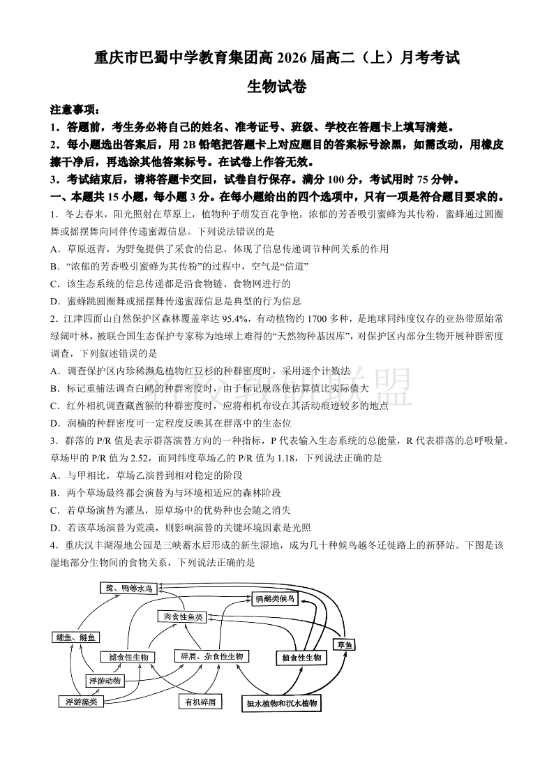 重庆市巴蜀中学高2026届高二(下)3月月考 生物(含答案).pdf