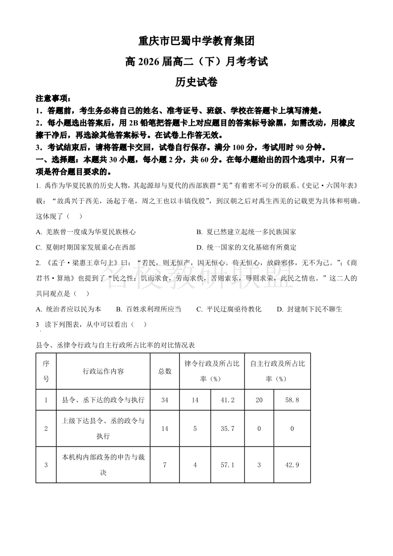 重庆市巴蜀中学高2026届高二(下)3月月考 历史(含答案).pdf