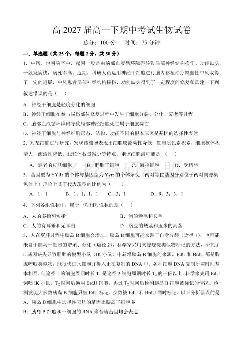 四川省达州市万源中学2024-2025学年高一下学期期中考试 生物.pdf