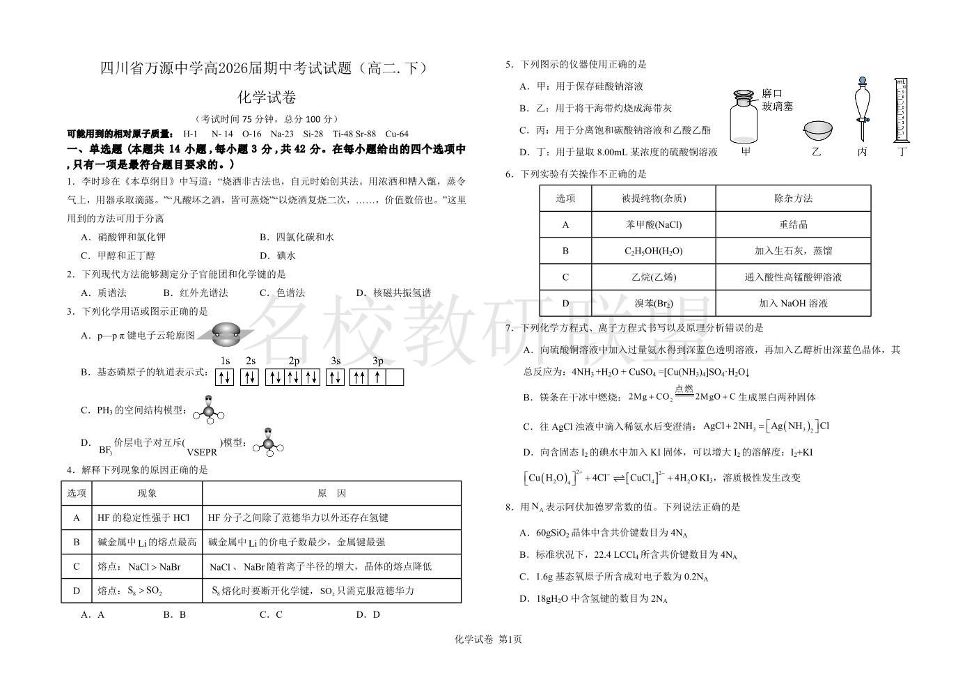 四川省达州市万源中学2024-2025学年高二下学期期中考试 化学.pdf