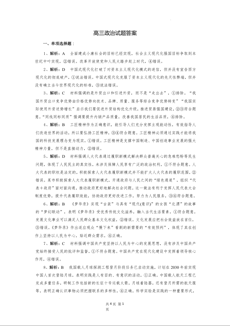 湖北省部分高中协作体2024-2025学年高三下学期4月期中联考 政治答案.docx