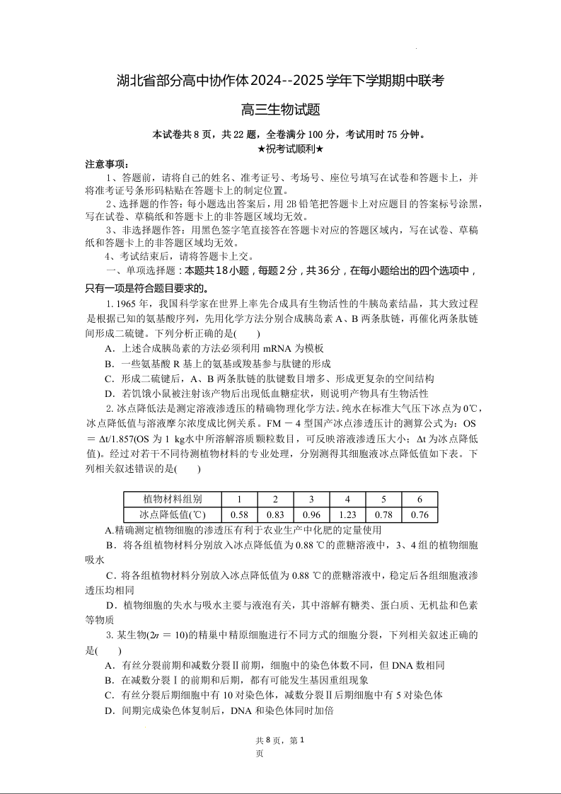 湖北省部分高中协作体2024-2025学年高三下学期4月期中联考 生物.docx