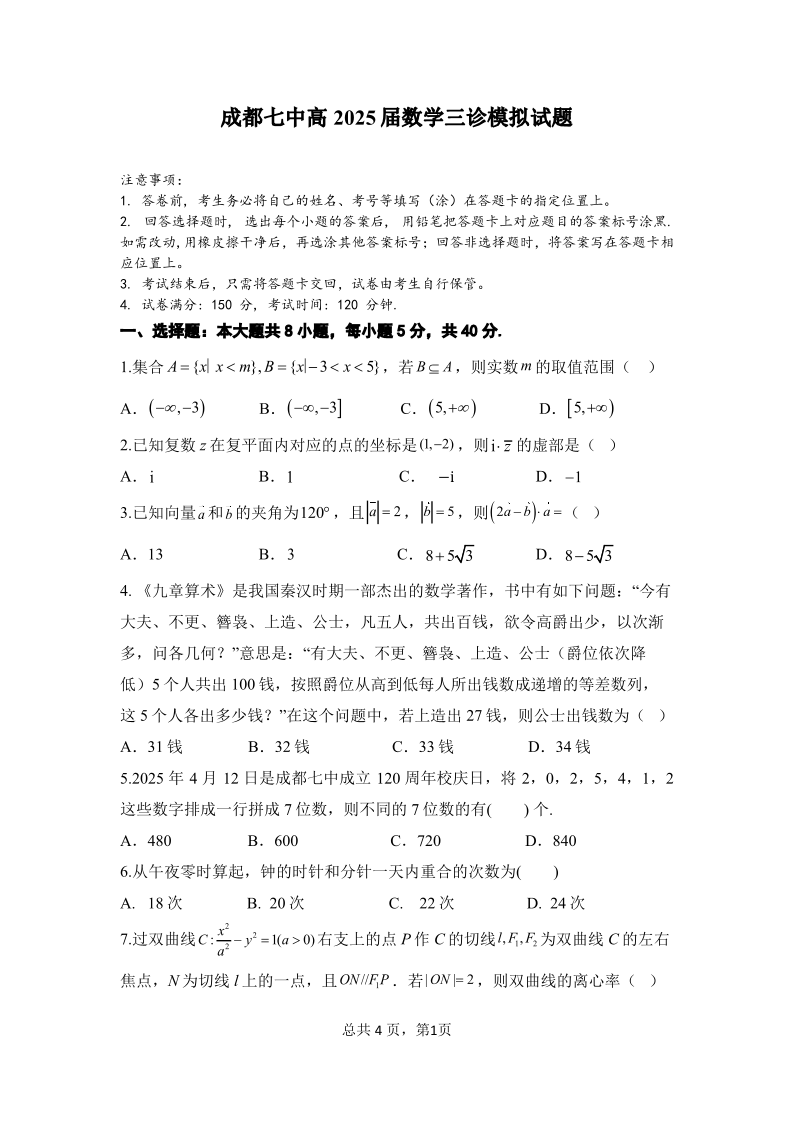 四川省成都市第七中学2024~2025学年度下期高2025届三诊模拟考试 数学.pdf