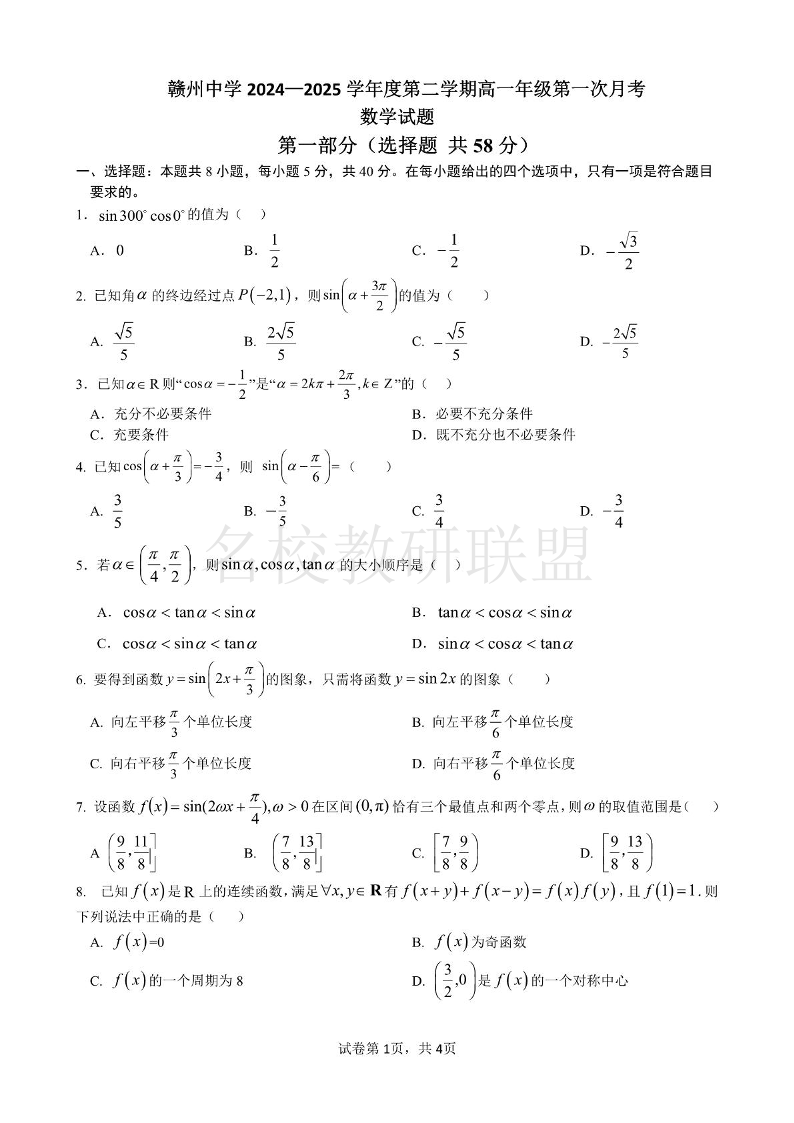 江西省赣州市赣州中学2024-2025学年高一下学期第一次月考 数学(含答案).pdf