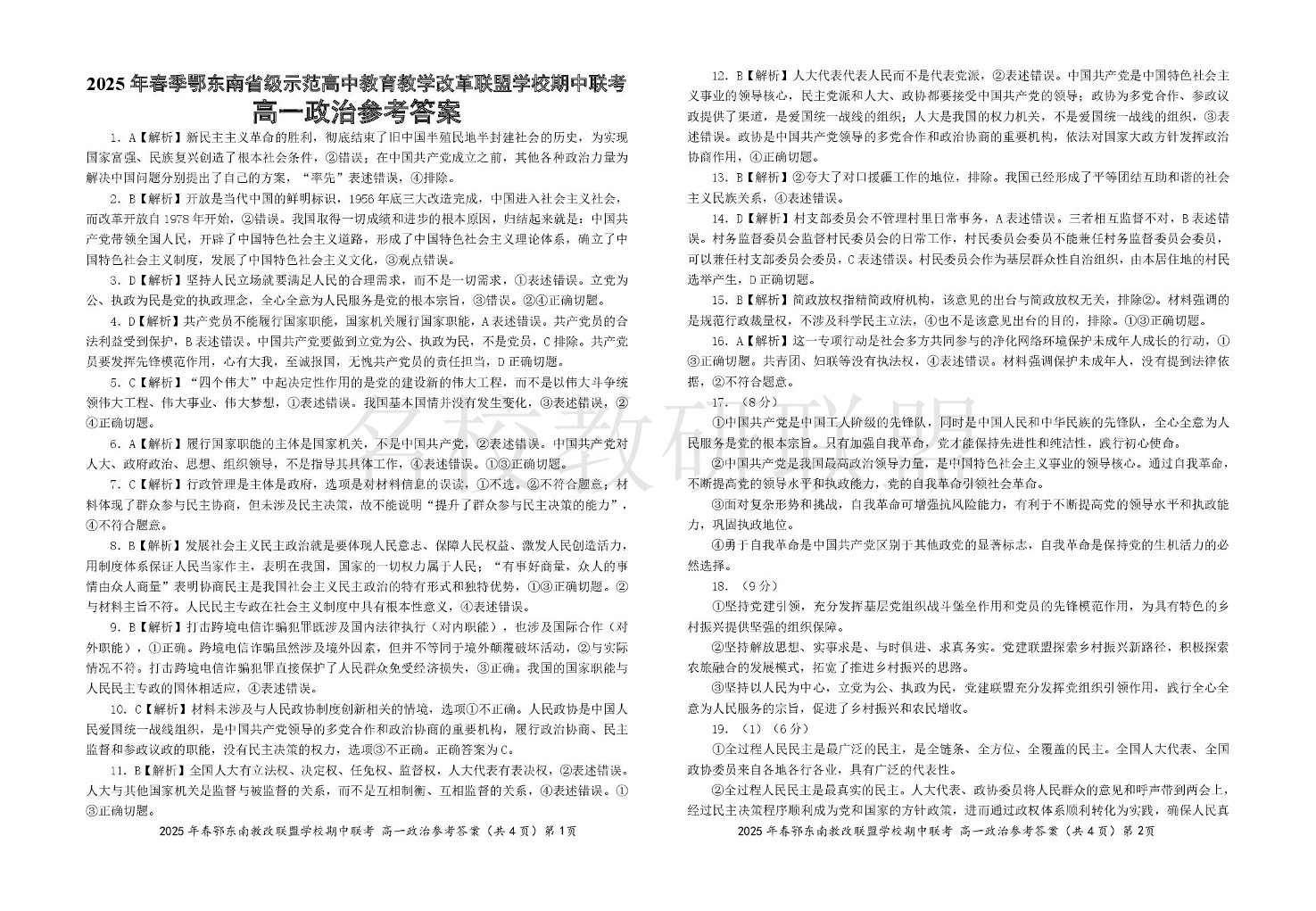2025年春季湖北省鄂东南省级示范高中高一下学期期中联考 政治答案.pdf
