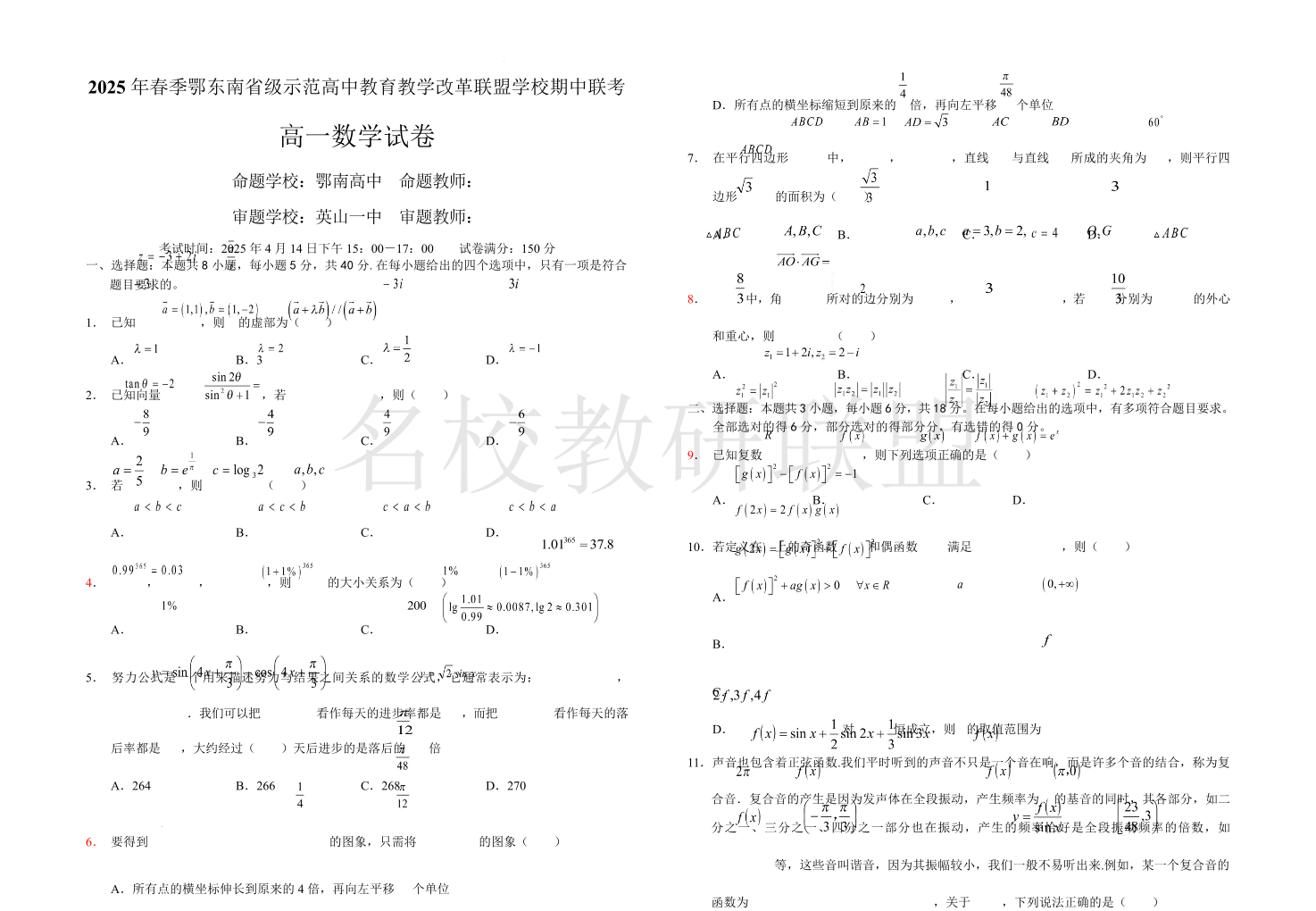 2025年春季湖北省鄂东南省级示范高中高一下学期期中联考 数学.pdf