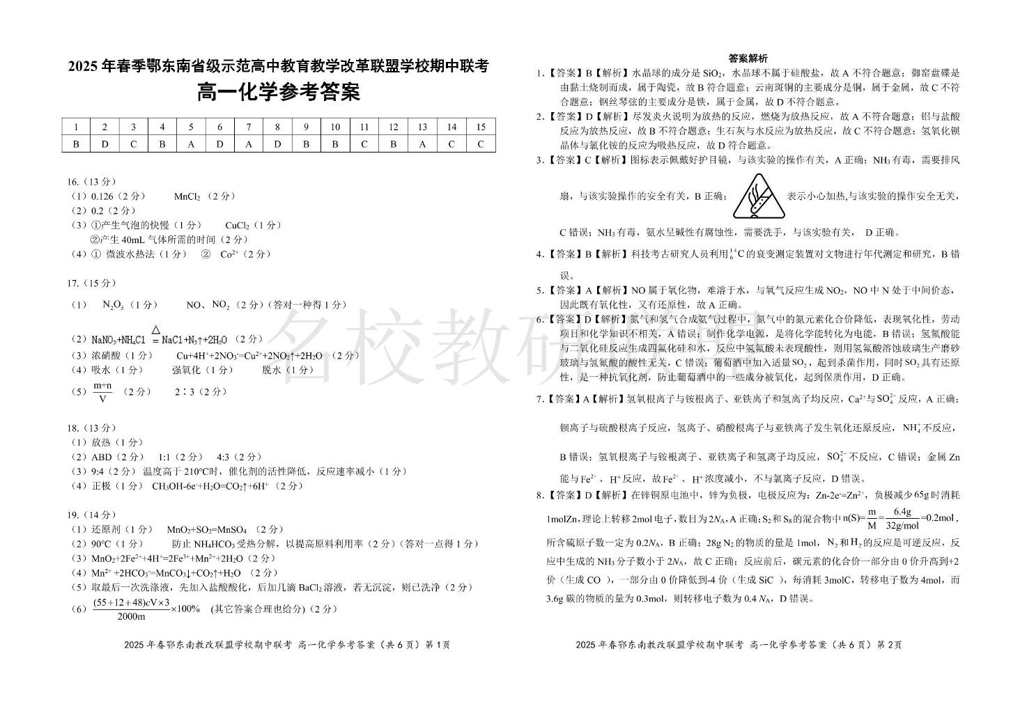 2025年春季湖北省鄂东南省级示范高中高一下学期期中联考 化学答案.pdf