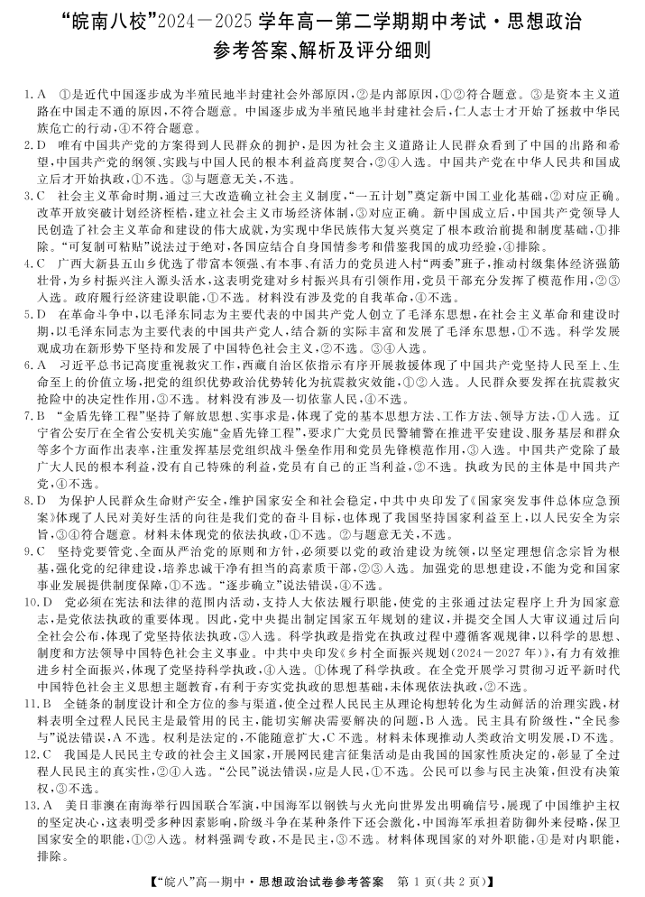 “皖南八校”2024-2025学年高一第二学期期中考试-政治答案.pdf