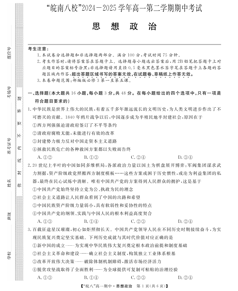 “皖南八校”2024-2025学年高一第二学期期中考试-政治.pdf