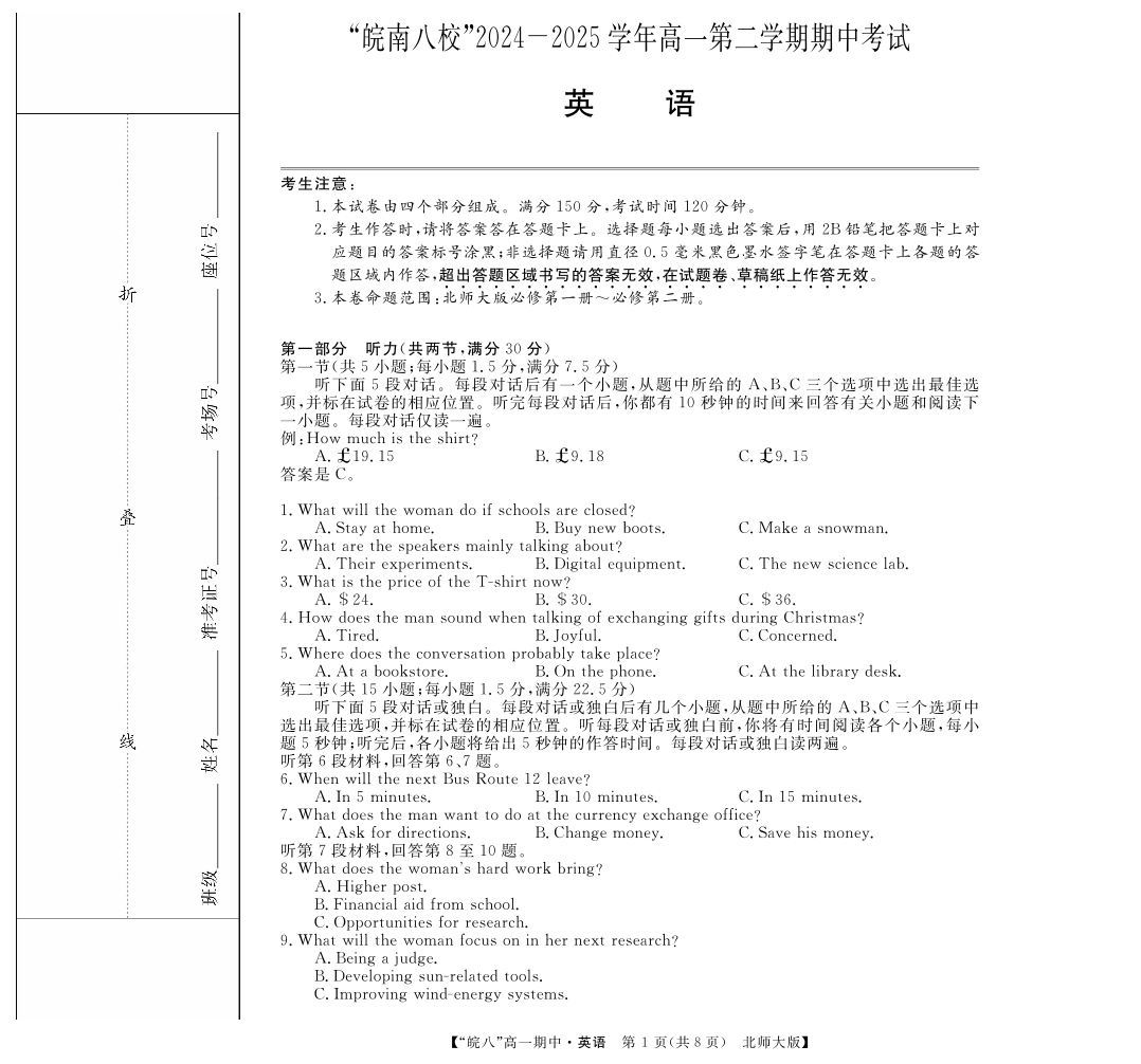 “皖南八校”2024-2025学年高一第二学期期中考试-英语(北师大版).pdf