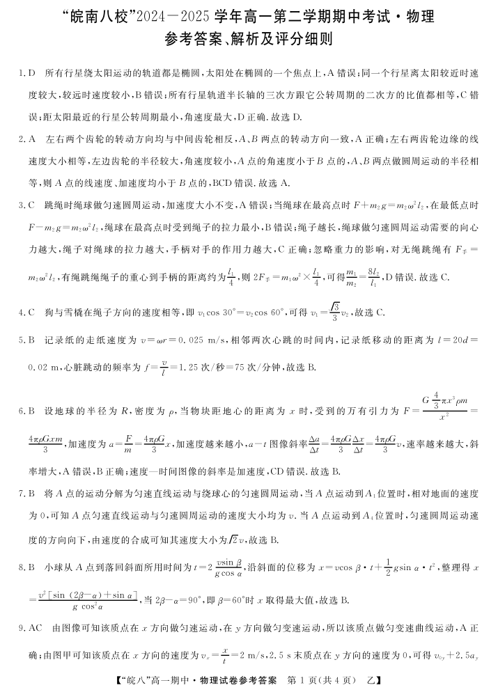 “皖南八校”2024-2025学年高一第二学期期中考试-物理(乙)答案.pdf