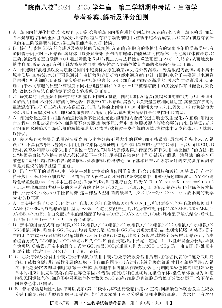 “皖南八校”2024-2025学年高一第二学期期中考试-生物(甲)答案.pdf