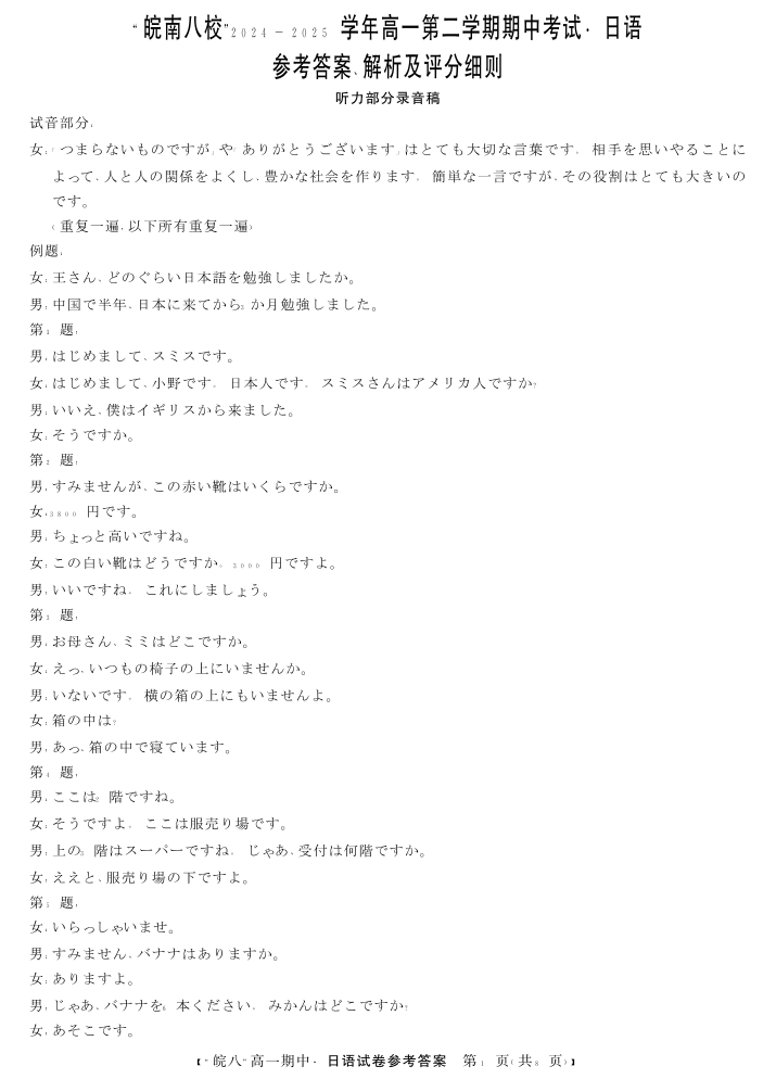 “皖南八校”2024-2025学年高一第二学期期中考试-日语答案.pdf