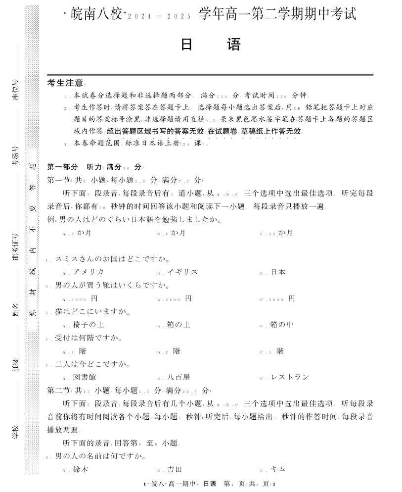 “皖南八校”2024-2025学年高一第二学期期中考试-日语.pdf