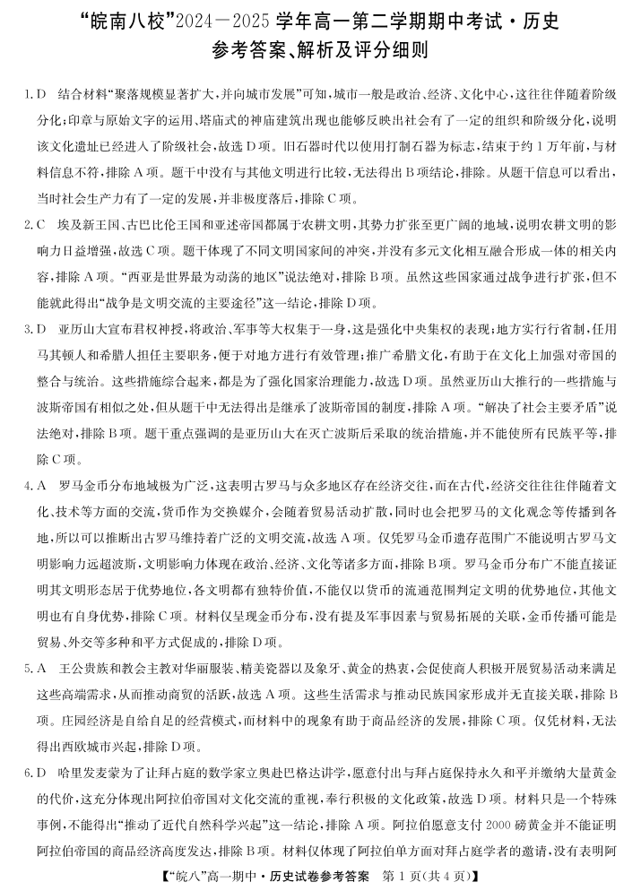 “皖南八校”2024-2025学年高一第二学期期中考试-历史答案.pdf