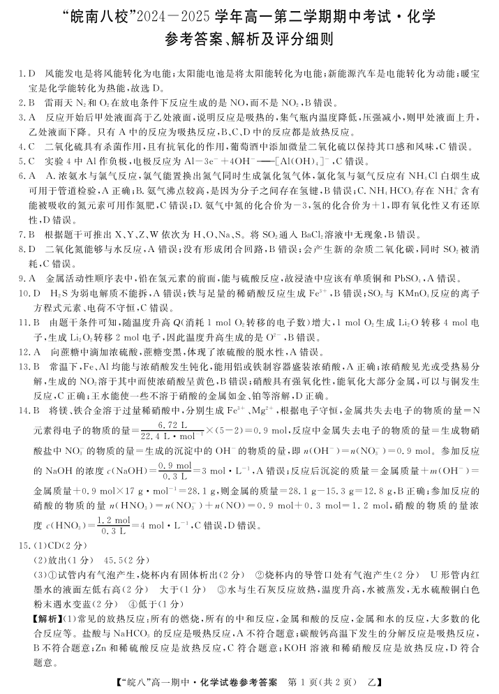 “皖南八校”2024-2025学年高一第二学期期中考试-化学(乙)答案.pdf