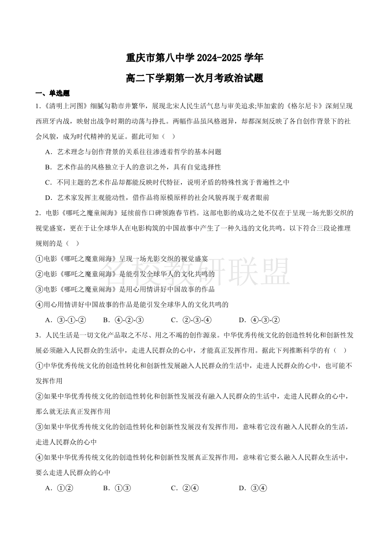 重庆市第八中学2024-2025学年高二下学期第一次月考试题 政治(含答案).pdf