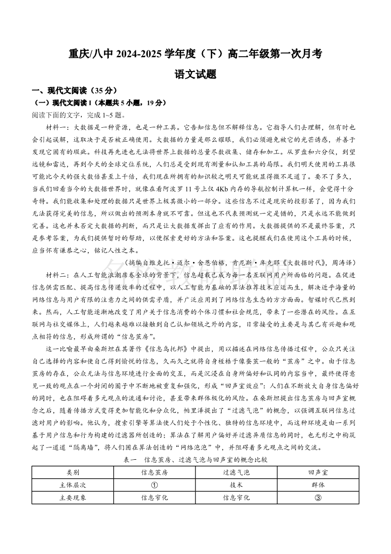 重庆市第八中学2024-2025学年高二下学期第一次月考试题 语文(含答案).pdf