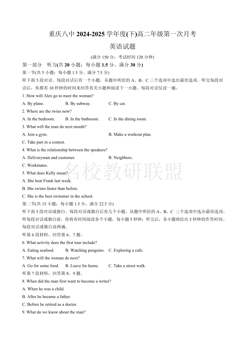 重庆市第八中学2024-2025学年高二下学期第一次月考试题 英语(含答案).pdf