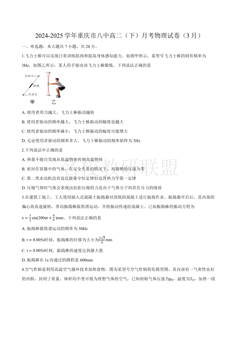 重庆市第八中学2024-2025学年高二下学期第一次月考试题 物理(含答案).pdf