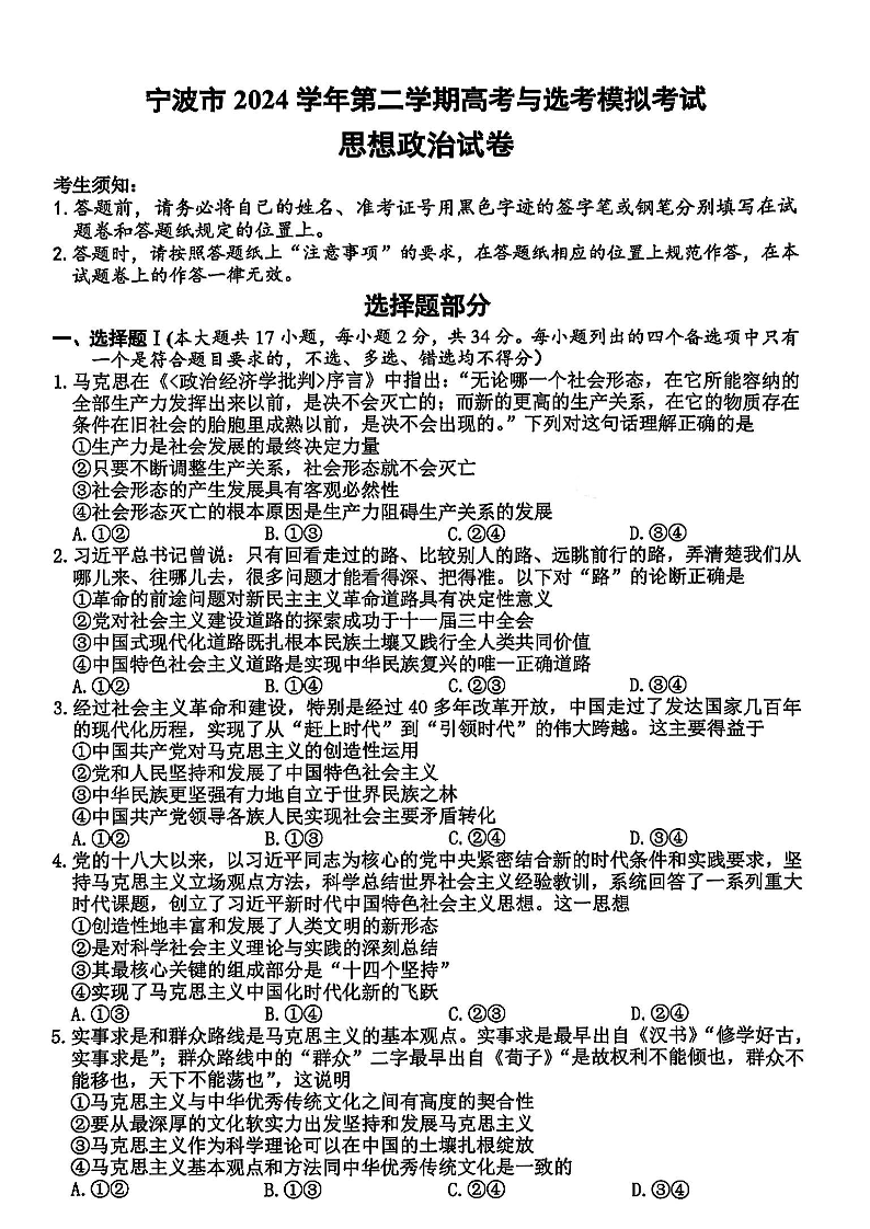 宁波市2024学年第二学期高考与选考模拟考试 政治.pdf