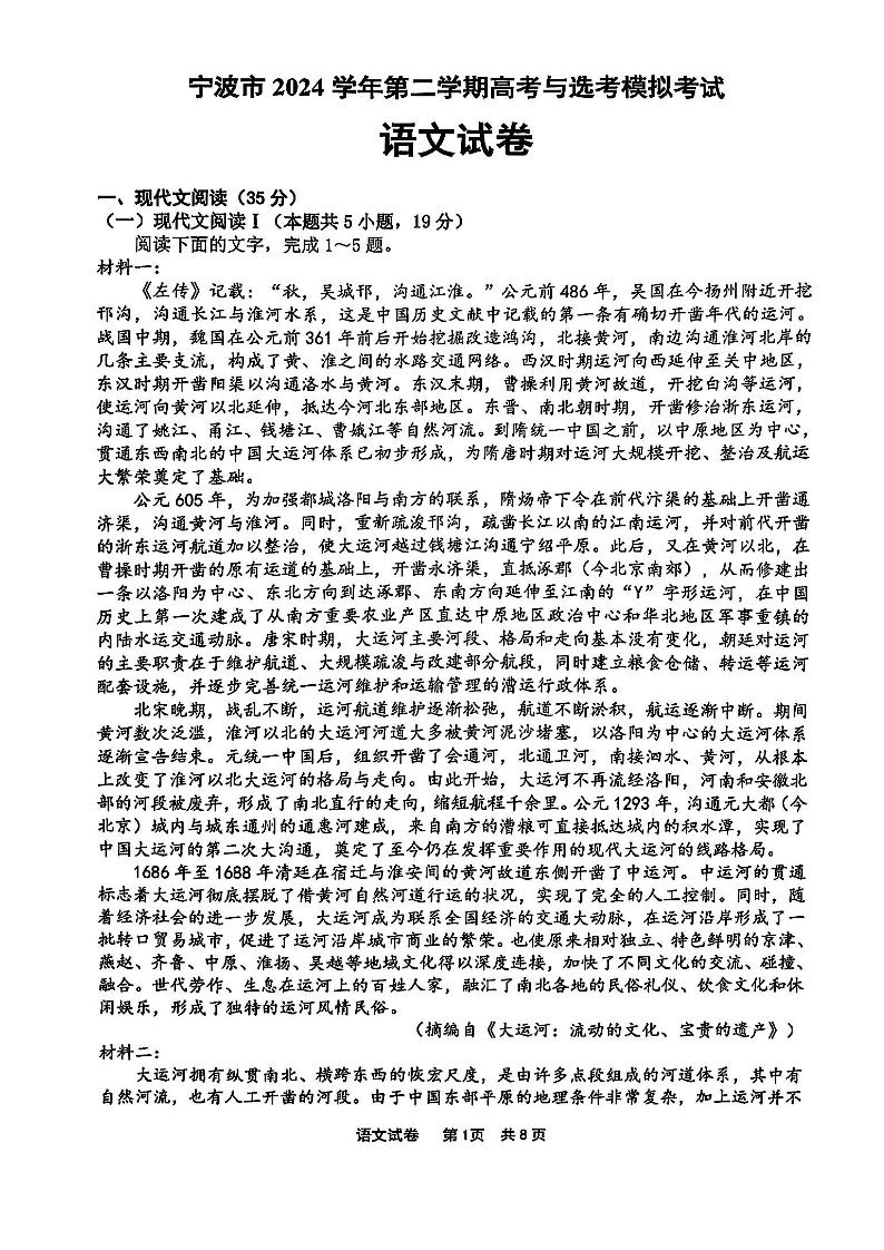 宁波市2024学年第二学期高考与选考模拟考试 语文.pdf