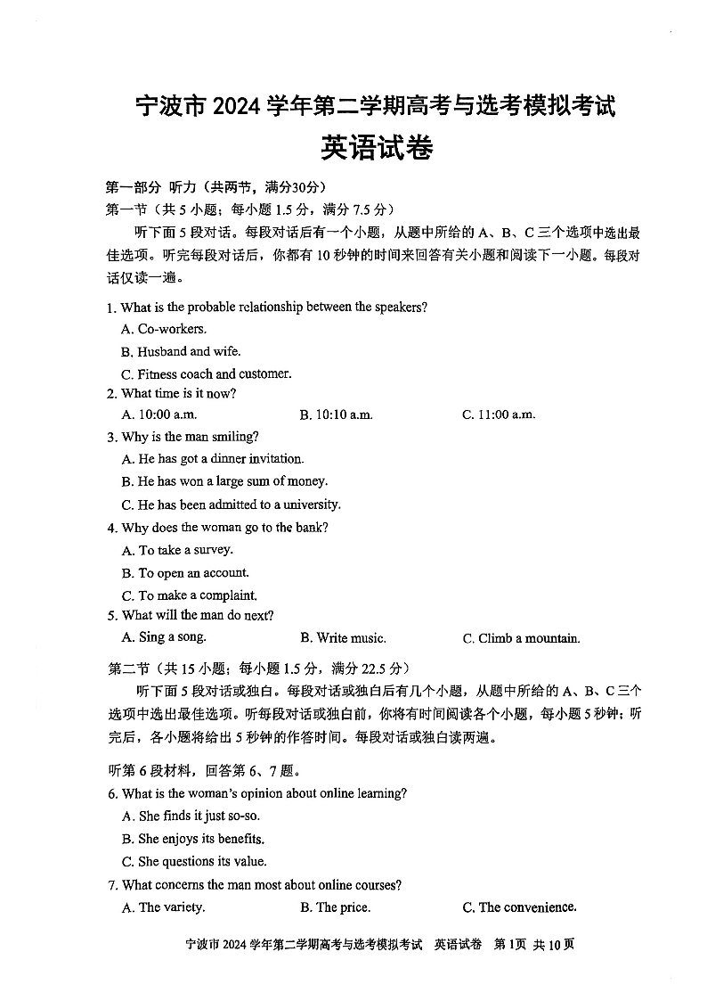 宁波市2024学年第二学期高考与选考模拟考试 英语.pdf