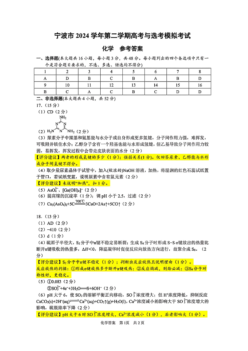 宁波市2024学年第二学期高考与选考模拟考试 化学答案.pdf