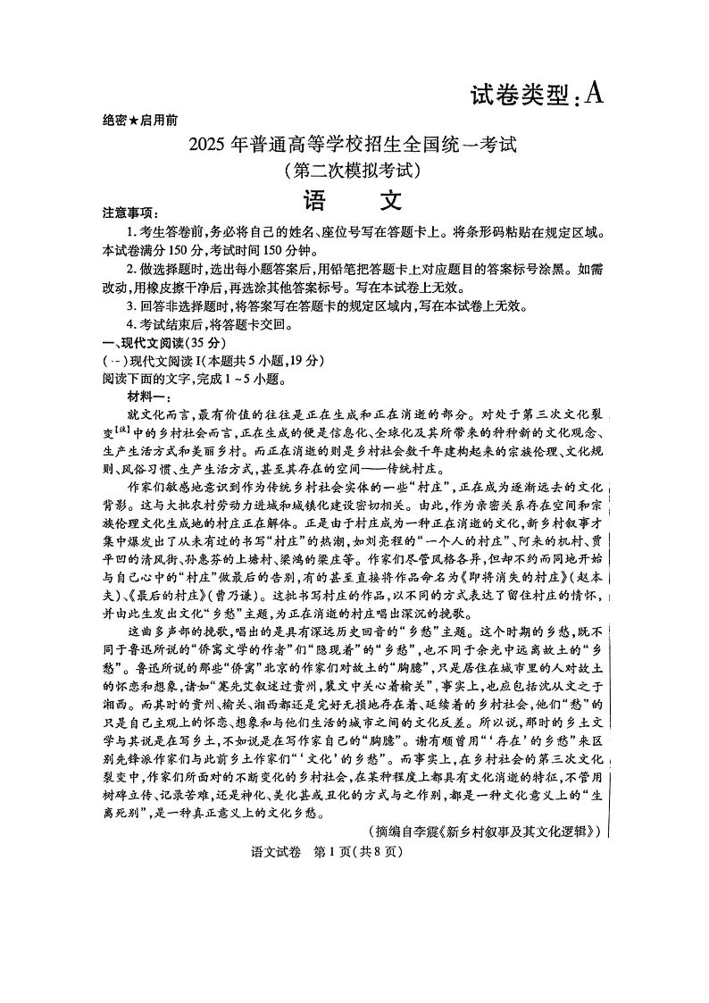 包头市2025年高三第二次模拟考试 语文.pdf