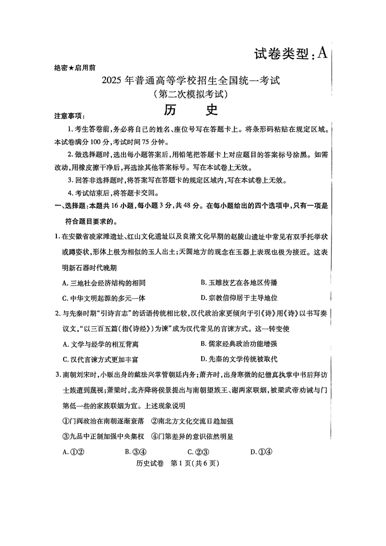 包头市2025年高三第二次模拟考试 历史.pdf
