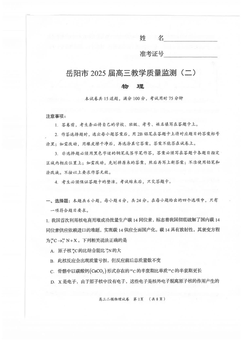 湖南省岳阳市2025届高三教学质量监测(二)物理(含答案).pdf