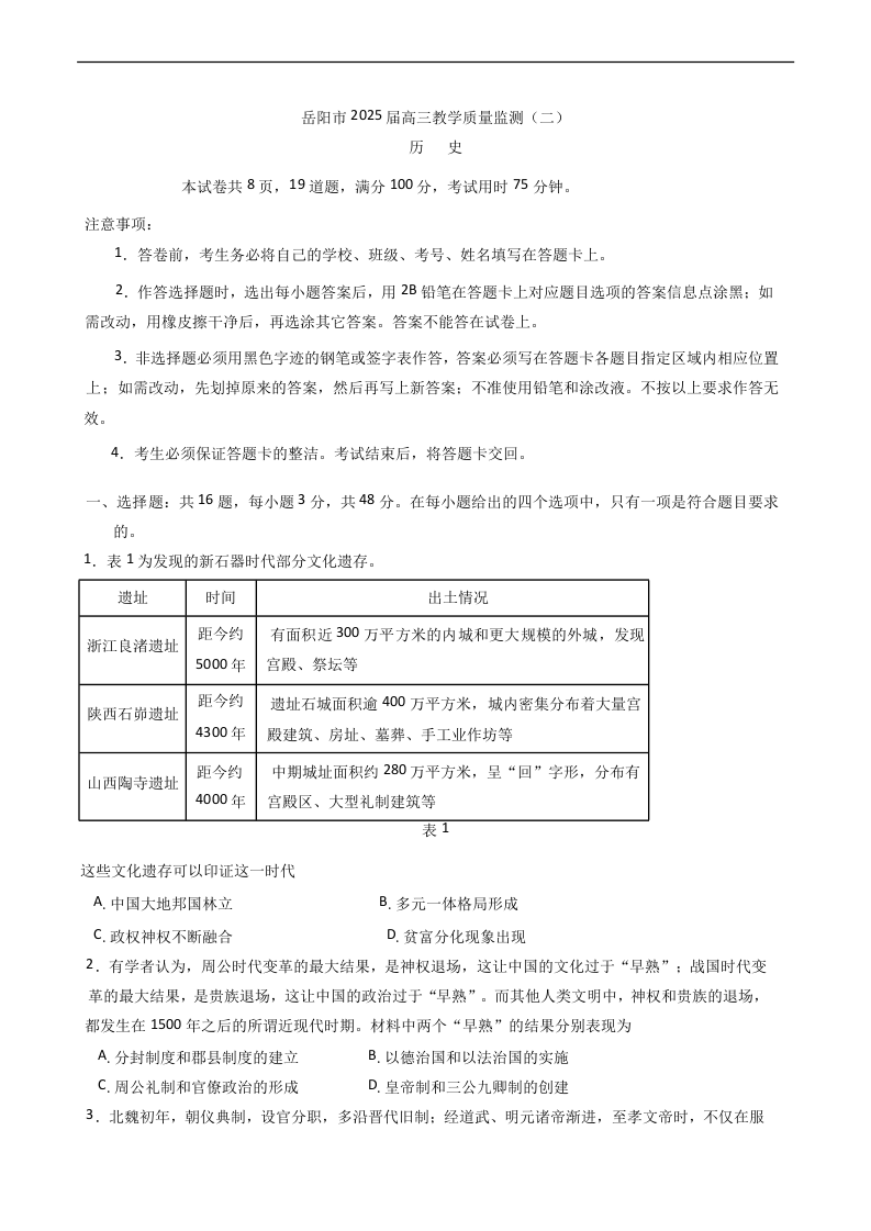 湖南省岳阳市2025届高三教学质量监测(二)历史(含答案).docx