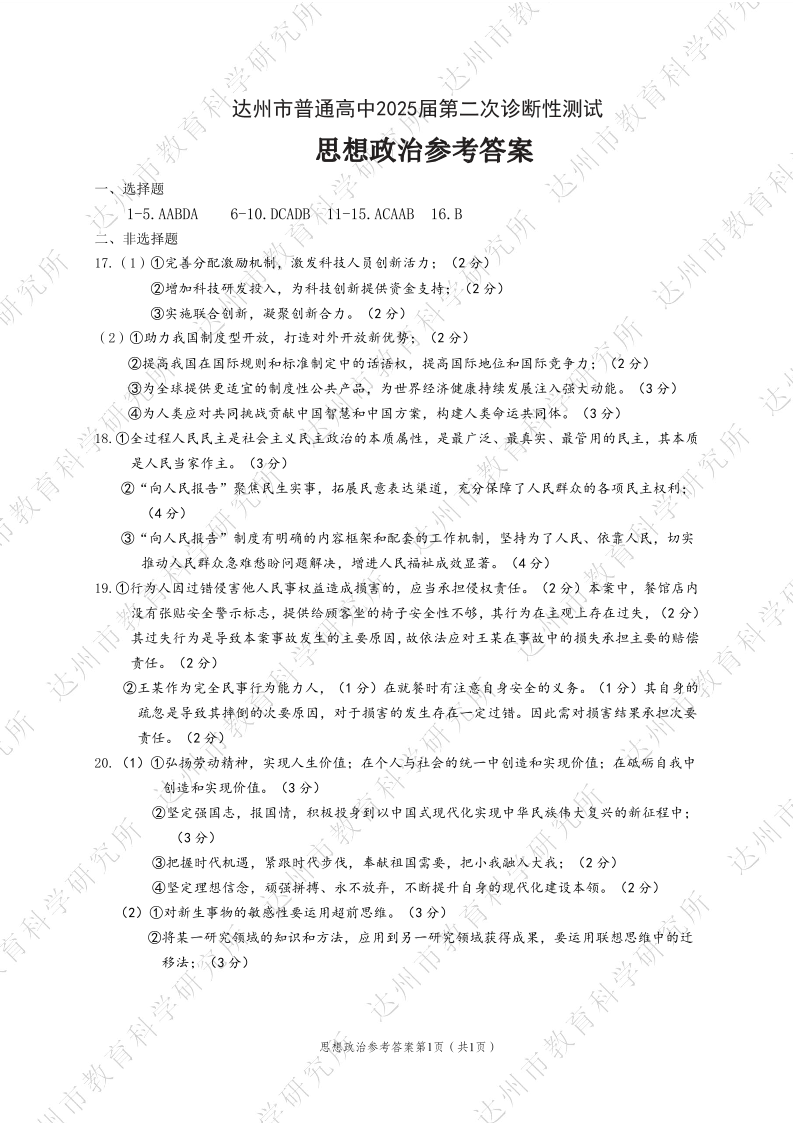 达州市普通高中2025届第二次诊断性测试 政治答案.pdf