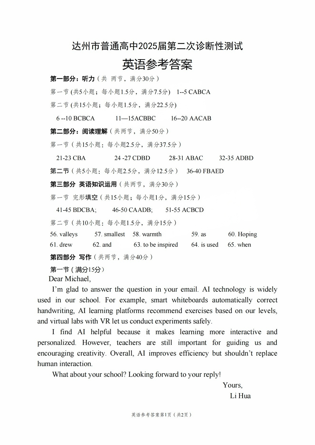 达州市普通高中2025届第二次诊断性测试 英语答案.pdf