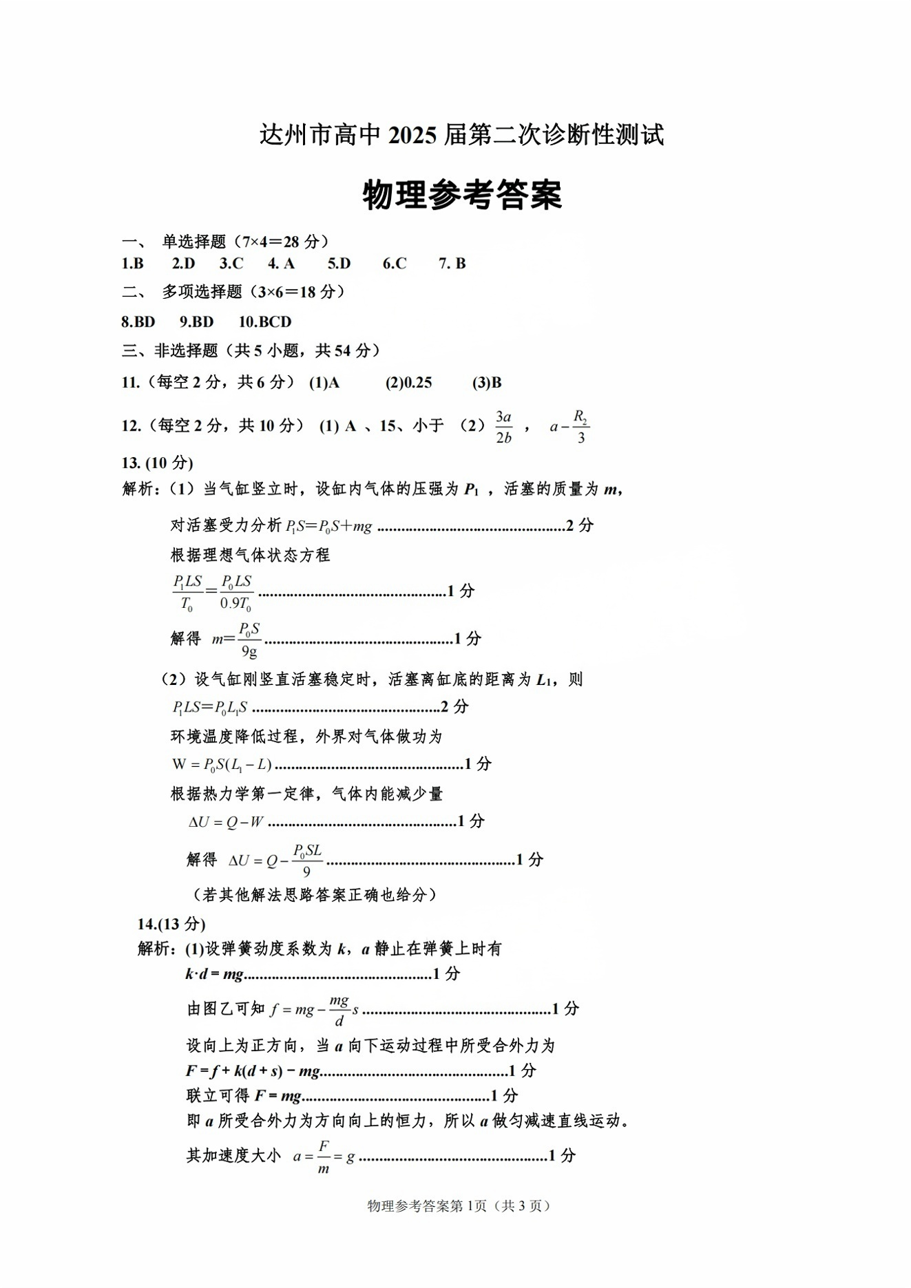 达州市普通高中2025届第二次诊断性测试 物理答案.pdf