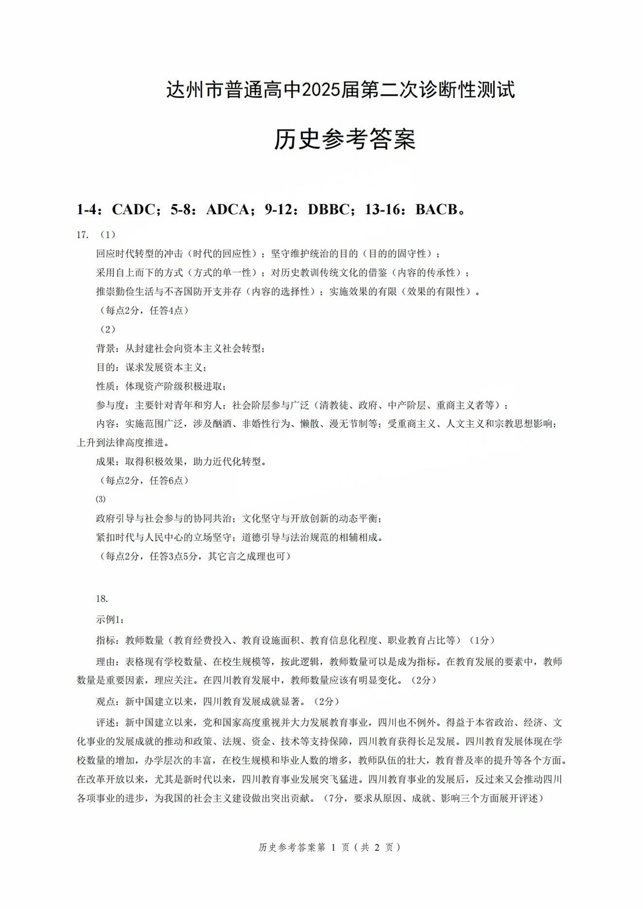 达州市普通高中2025届第二次诊断性测试 历史答案.pdf