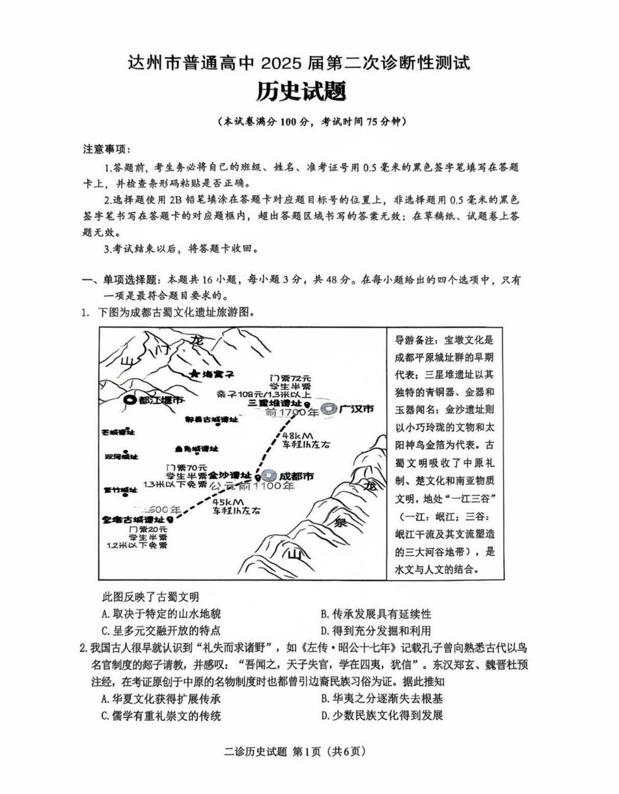 达州市普通高中2025届第二次诊断性测试 历史.pdf