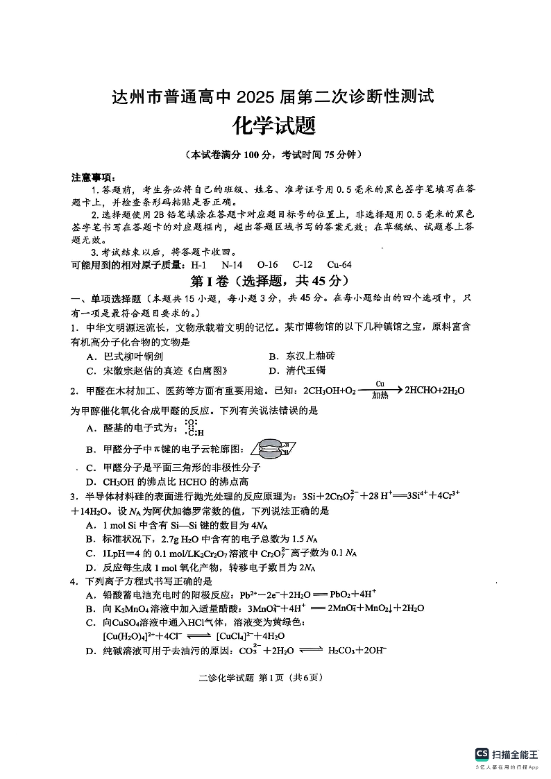 达州市普通高中2025届第二次诊断性测试 化学.pdf