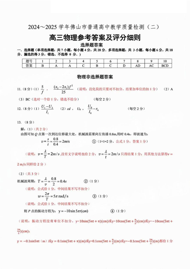 广东省2024-2025学年佛山市普通高中教学质量检测(二)物理答案.pdf