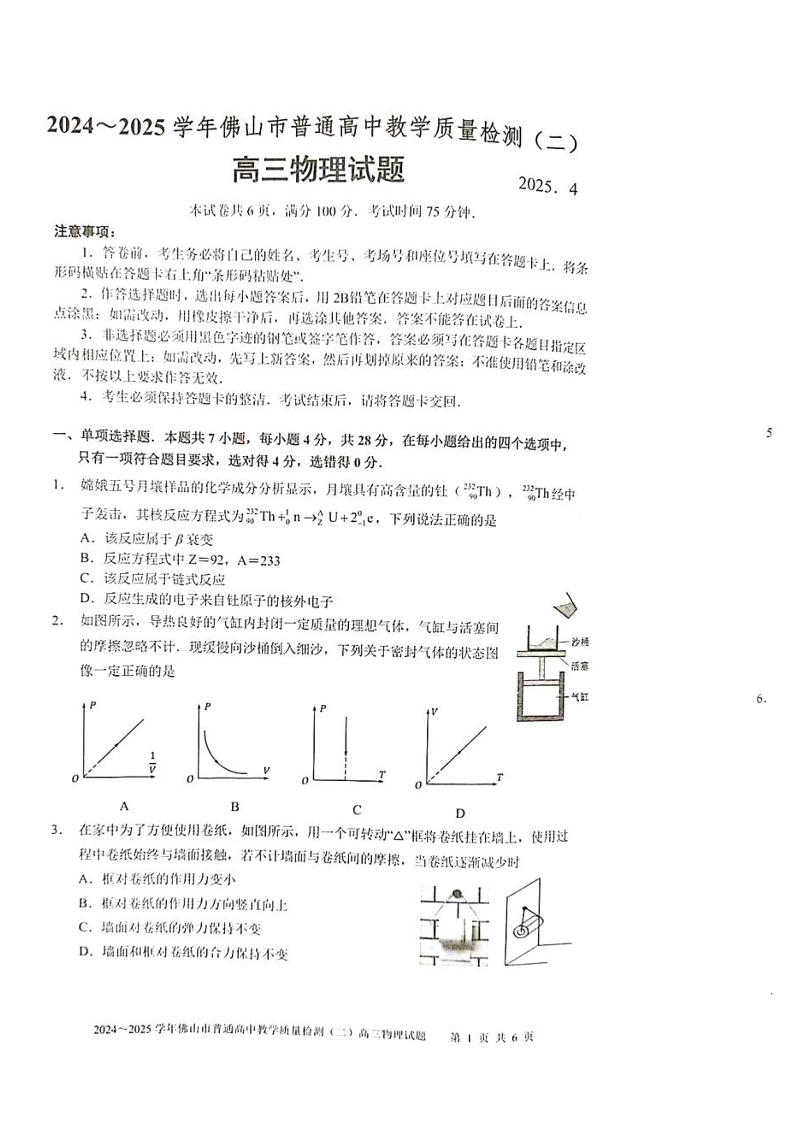 广东省2024-2025学年佛山市普通高中教学质量检测(二)物理.pdf