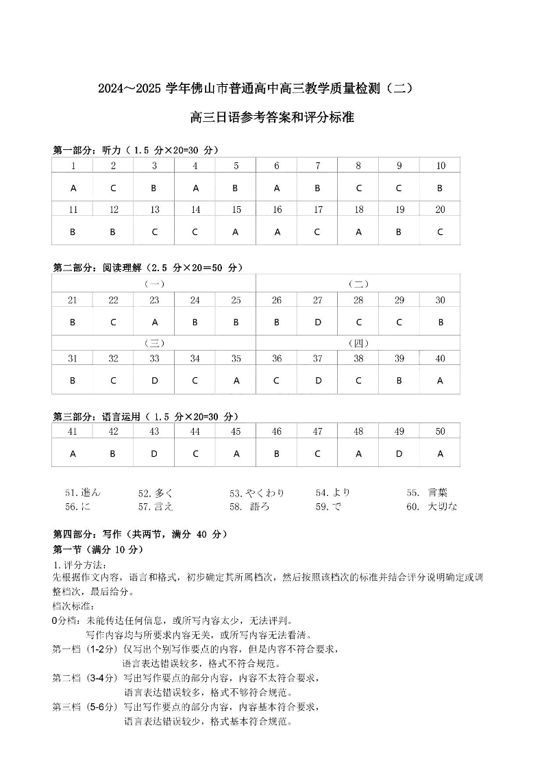广东省2024-2025学年佛山市普通高中教学质量检测(二)日语答案.pdf