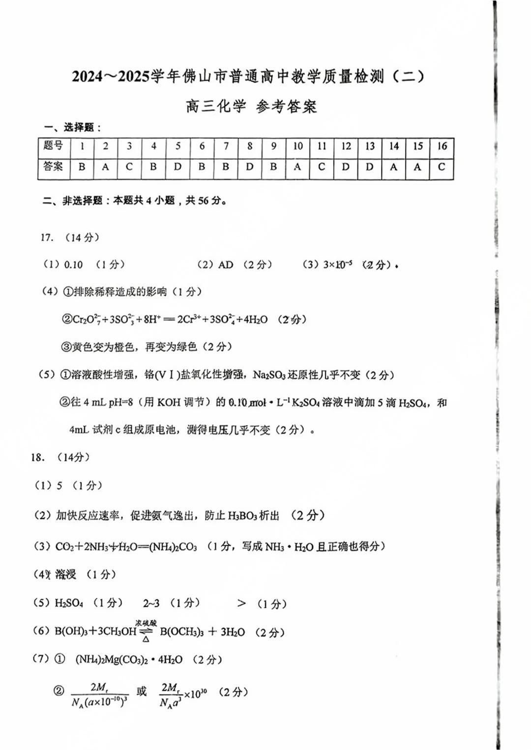 广东省2024-2025学年佛山市普通高中教学质量检测(二)化学答案.pdf